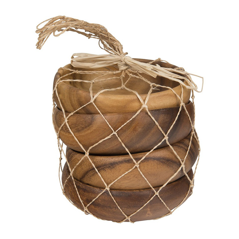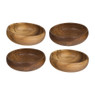 Deze set bevat 4 schaaltjes gemaakt van acacia hout. De diameter is 10 centimeter. Je kunt ze overal voor gebruiken. De kleur is donkerbruin.
