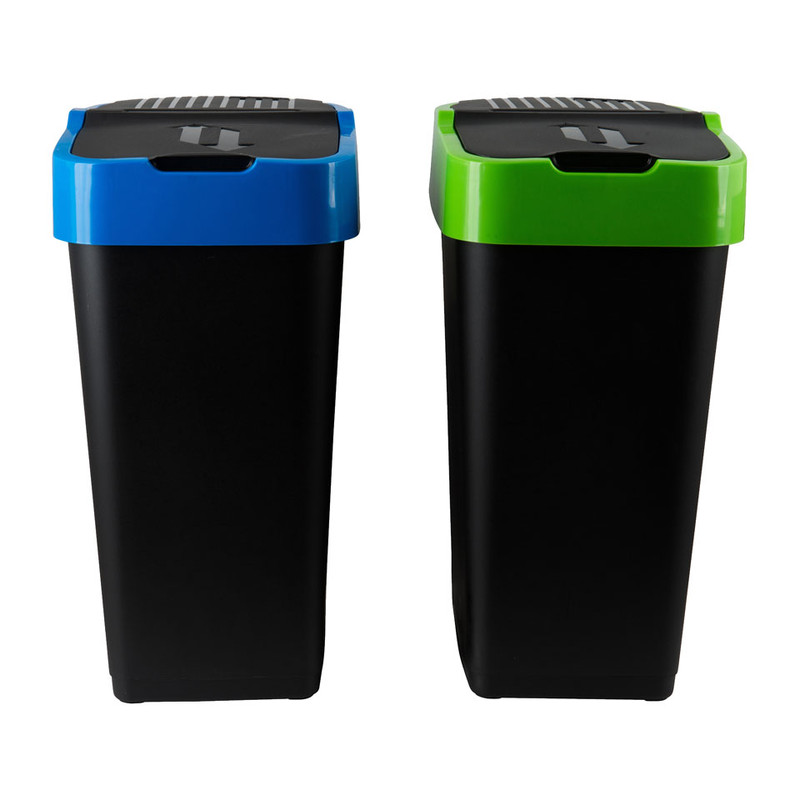 Set van 2 handige zwarte afvalbakken om je afval te kunnen scheiden. De bakken hebben 2 verschillende kleuren deksels, zodat je bijvoorbeeld glas en papier makkelijk kunt scheiden. Handig voor in de keuken! Deze bakken hebben een functioneel rechthoekig design, zodat je deze makkelijk tegen een muur kan plaatsen of in een hoek. Zo maak je optimaal gebruik van de ruimte. De afvalbakken hebben ieder een inhoud van 35 liter en is daarmee een compact formaat. Beide afvalemmers zijn 51 cm hoog, 26 cm breed en 33 cm diep en hebben een deksel die kan kantelen. Op zoek naar een ander formaat? Bekijk ook onze andere modellen en formaten.