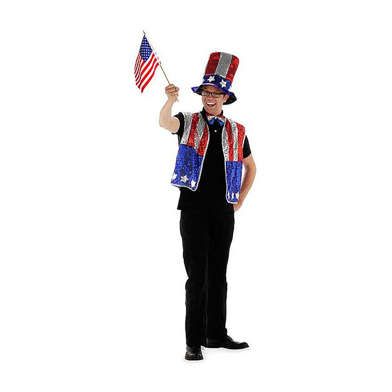In deze set van Amerikaanse feestkleding zit een gilet hesje, een hoge hoed en een strik.