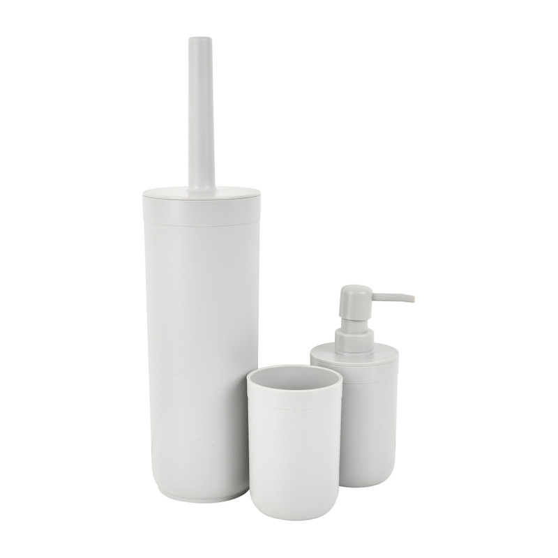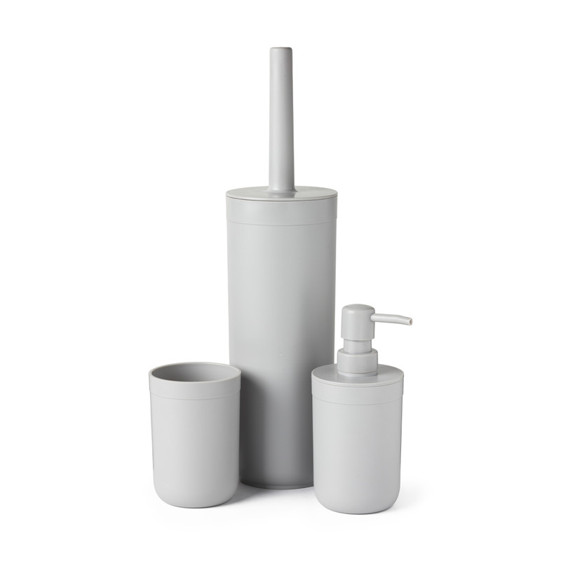 Maak van jouw badkamer één stijlvol geheel met deze mat grijze badkamerset. De set bestaat uit een toiletborstel, zeeppomp en een tandenborstelbeker. Alles wat je nodig hebt dus! De toiletborstel bevat een handige koker welke afgesloten is en de zeeppomp is makkelijk bij te vullen. De producten zijn gemaakt van plastic.