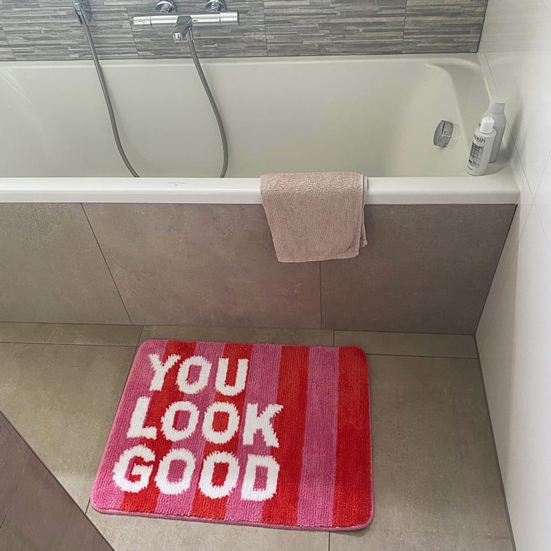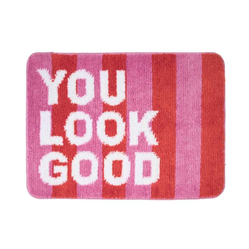 Deze trendy badmat fleurt jouw badkamer gegarandeerd op. De badmat is roze met oranje van kleur waardoor de witte tekst: You Look Good, extra goed opvalt. De badmat is niet alleen stijlvol, maar ook erg comfortable voor je voeten. De oppervlakte voelt heerlijk zacht aan en door de anti-slip achterkant blijft deze badmat netjes op zijn plek liggen. De badmat is gemaakt van microvezel en heeft een lengte van 50 cm en een breedte van 70 cm.