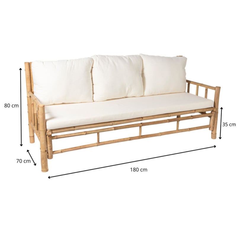 De bamboe 3-zits heeft een breedte van 180 cm, een diepte van 70 cm en hoogte van 80 cm. Daarnaast heeft de bank een zithoogte van 35 cm en een zitdiepte van 70 cm.