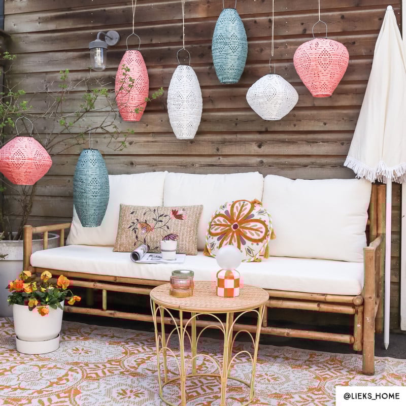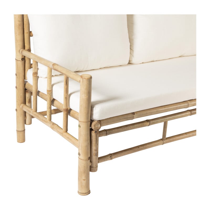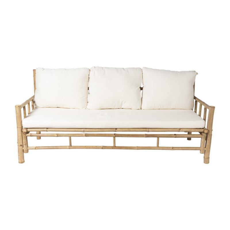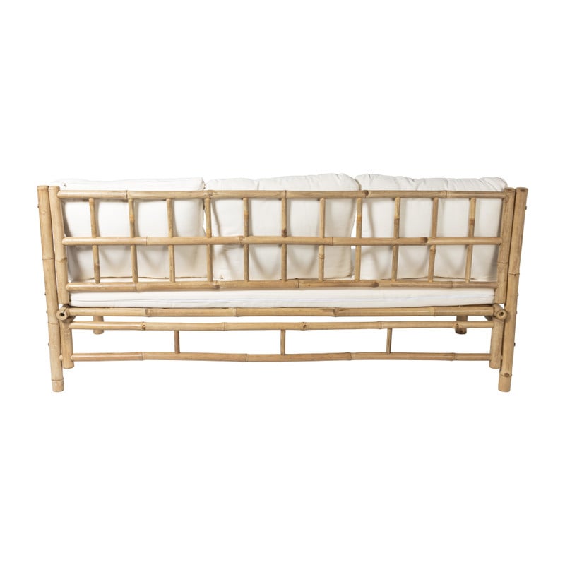 De 3-zits bank is gemaakt van bamboe en heeft een mooie lichte kleur.