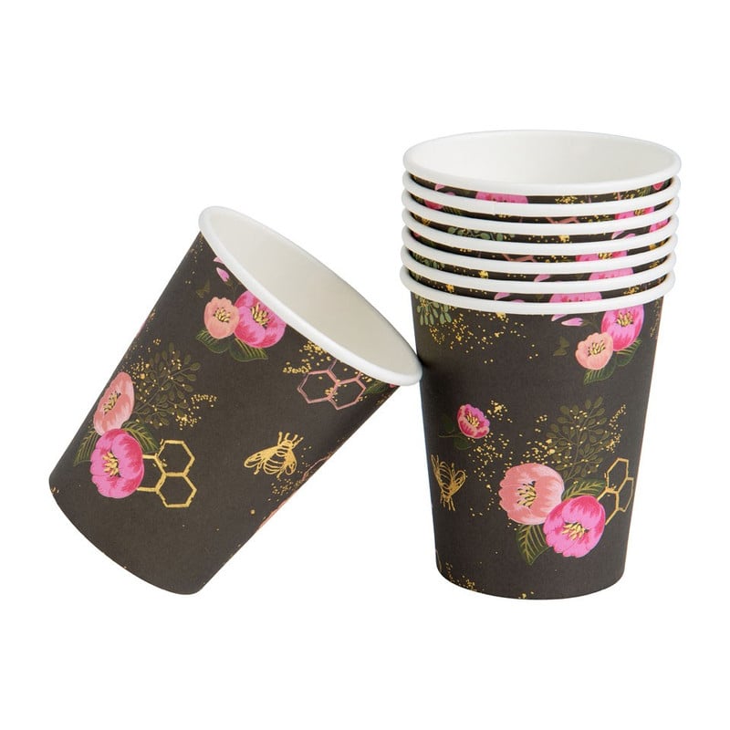 Deze stijlvolle wegwerp bekers zijn ideaal voor al je drankjes tijdens een feestje! Deze mooie serie van wegwerp artikelen heeft een zwarte achtergrond en een prachtige tekening van bloemen en een honingraat met bijen. Deze wegwerp bekers mogen gezien op een feestje. De bekers zijn gemaakt van papier, hebben een doorsnede van 7 cm en zitten in een set van 8 stuks. Met de bijpassende bakjes, borden, prikkers, servetten creëer je een stijlvolle feestelijke sfeer. Bekijk ze allemaal!