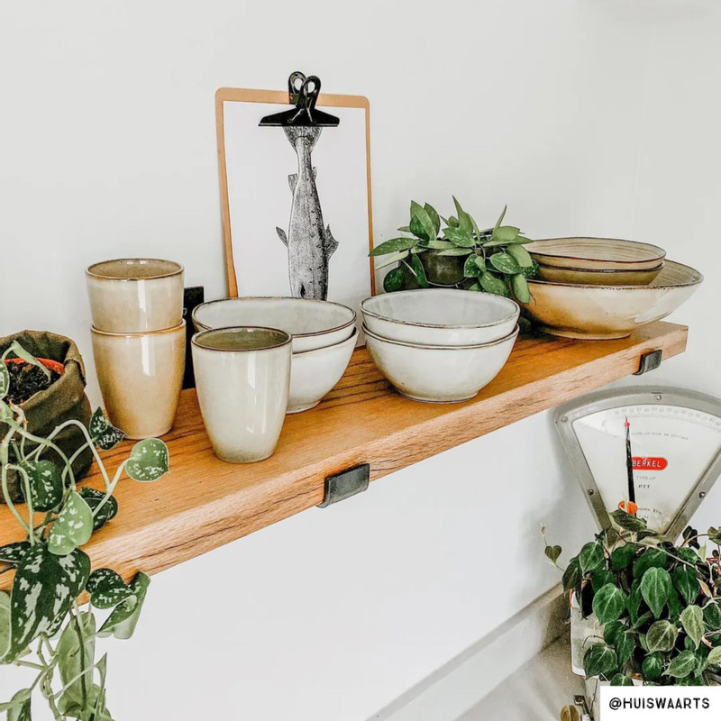 Dit product is voorzien van reactive glaze, een bijzonder type glazuur dat wordt toegepast bij de productie van deze aardewerk items. Het glazuur reageert op de chemische samenstelling van het materiaal en de omgeving tijdens het bakproces, waardoor elk item een unieke afwerking krijgt.