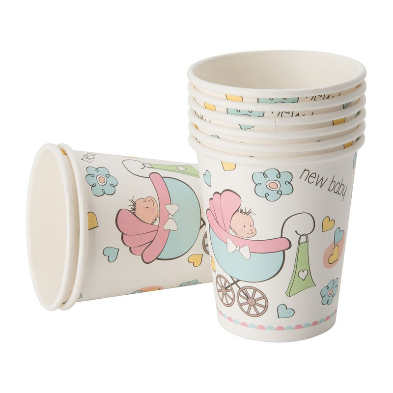 Een echte musthave voor je babyshower of kraamfeest, deze wegwerpbekers met babyprint. Niet alleen heel leuk, maar ook super handig. De bekers zijn gemaakt van papier en zitten in een set van 8 stuks. De afmeting van de bekers is 8.5x7 cm. Combineer met de andere artikelen uit deze serie om er een mooi geheel van te maken.