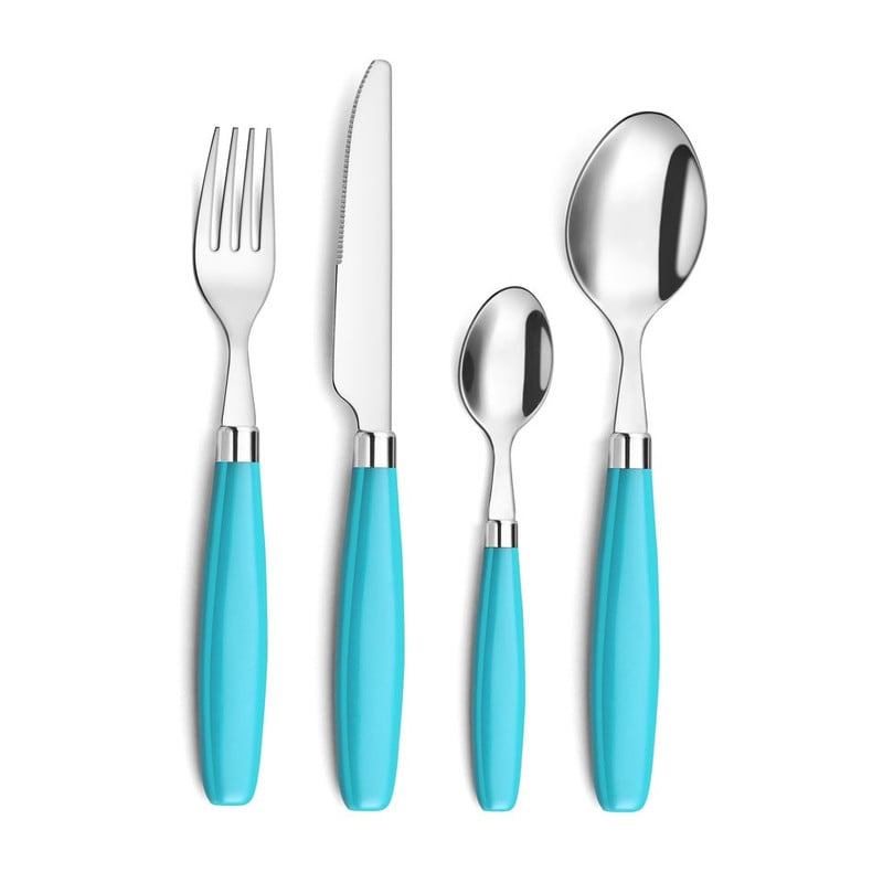 Dit tijdloze bestek heeft blauwe handvaten en geeft kleur aan de gedekte tafel. Het ronde handvat zorgt er voor dat het bestek fijn in hand ligt. Ideaal voor een gezellige barbecue of een feestelijk diner.