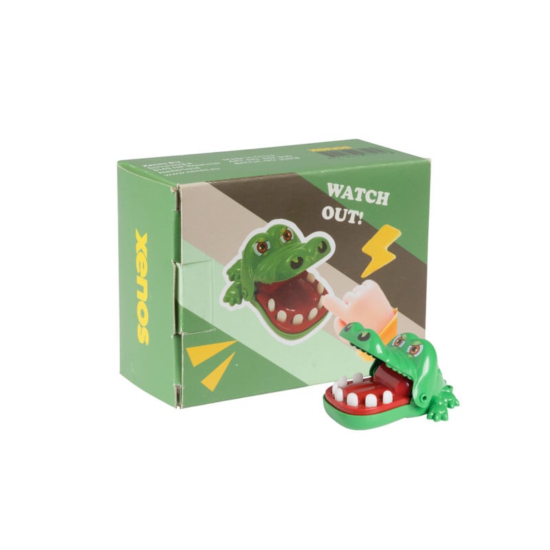Deze krokodil heeft kiespijn! Als je op de verkeerde tand drukt, gaat de bek van de krokodil met een klap dicht. Dit betekent dat de speler verliest en de ronde eindigt. Het spel gaat door totdat er één speler als laatste overblijft. De krokodil is 6x8x4 cm en heeft een kleine opening aan de bovenkant waardoor je het spel gemakkelijk aan een ketting kan rijgen.