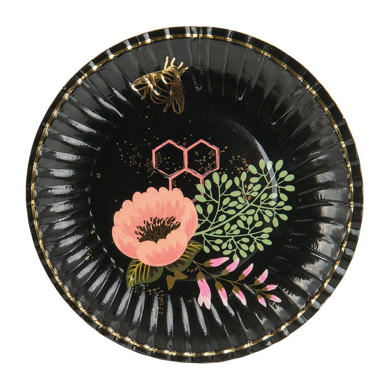 Deze stijlvolle wegwerp mini bordjes zijn ideaal voor al je snacks tijdens een feestje! Deze mooie serie van wegwerp artikelen heeft een zwarte achtergrond en een prachtige tekening van bloemen en een honingraat met bijen. Deze mini wegwerp bordjes mogen gezien op een feestje. De bordjes zijn gemaakt van papier, hebben een doorsnede van 10 cm en zitten in een set van 8 stuks. Met de bijpassende bekers, borden, prikkers, servetten creëer je een stijlvolle feestelijke sfeer. Bekijk ze allemaal!