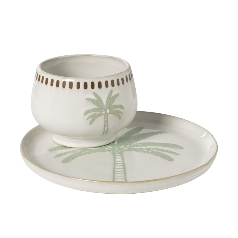 Breng tropische vibes naar je eettafel met dit palmboom bord. De combinatie van een warme, beige tint, een bruine omranding van het bord en een groene palmboom in het midden zorgt voor een speelse, boho uitstraling. Perfect voor zomerse diners, een tropisch ontbijtje of gewoon om je serviescollectie op te fleuren. Het bord is vaatwasserbestendig en kan in de magnetron.
