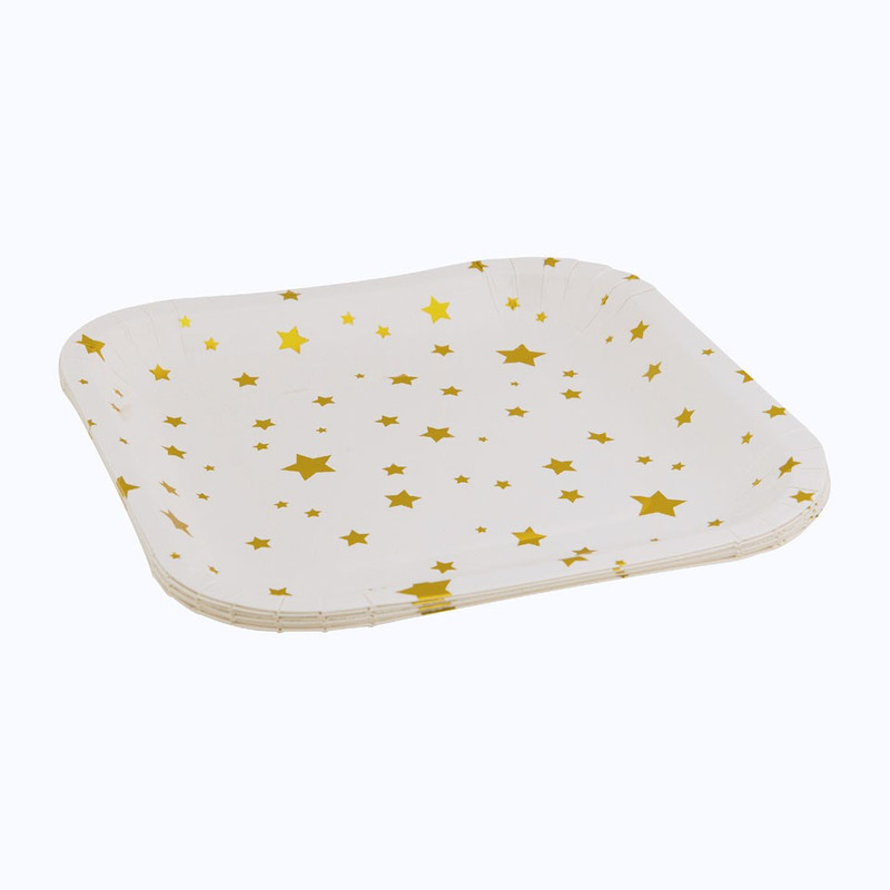 Serveer je hapjes op deze set van 6 feestelijke vierkanten wegwerpbordjes met gouden sterren. De witte borden met gouden sterren geven een feestelijke touch aan je servies. Ideaal tijdens een feestje. De bordjes hebben een afmeting van 16x16 cm en zijn gemaakt van papier. Ook handig wanneer je gaat barbecueën. Combineer met de andere artikelen uit deze serie om er een mooi geheel van te maken.