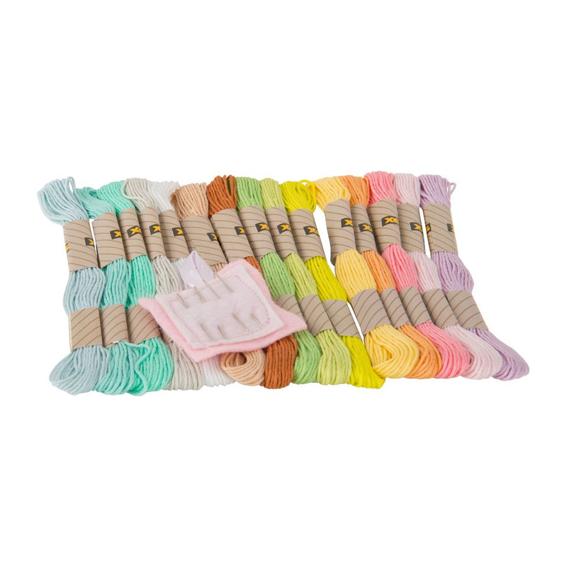 Met deze pastelkleurige borduurgaren geef je jouw borduursels een frisse, vrolijke uitstraling. De set bestaat uit 15 kleuren borduurgaren van 100% premium katoen. Het is 6-draads garen met een lengte van 8 meter per kleur. Daarnaast bevat de borduurset 1 stompe borduurnaald (maat 26), 2 scherpe borduurnaalden (maat 24) en 1 scherpe borduurnaald (maat 26).