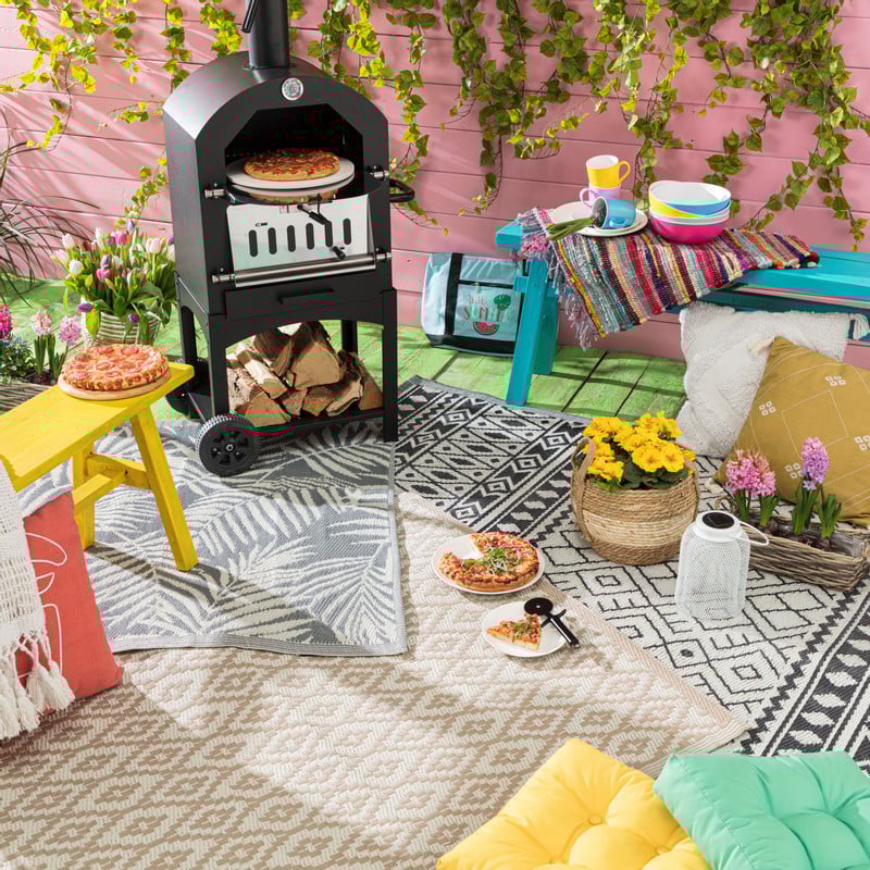 Buitenkleed met azteken patroon. Om jouw tuin of balkon extra gezellig te maken. Het kleed is gemaakt van gerecycled kunststof en heeft een afmeting van 120x180 cm.