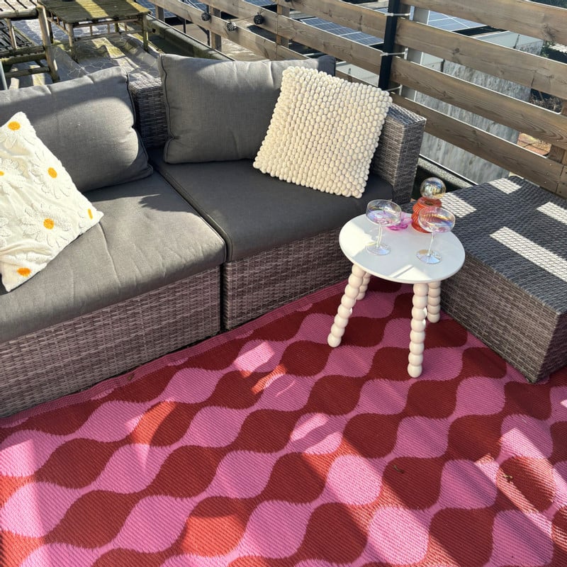 Breng een speelse en kleurrijke touch aan je tuin, balkon of terras met dit opvallende buitenkleed! Het kleed is voorzien van een dynamisch golvend patroon in levendige tinten rood en roze, waardoor het een echte eyecatcher is. Of je het nu onder je loungeset legt of als sfeervolle ondergrond gebruikt voor een gezellige zithoek, dit kleed tilt je buitenruimte direct naar een hoger én gezelliger niveau.