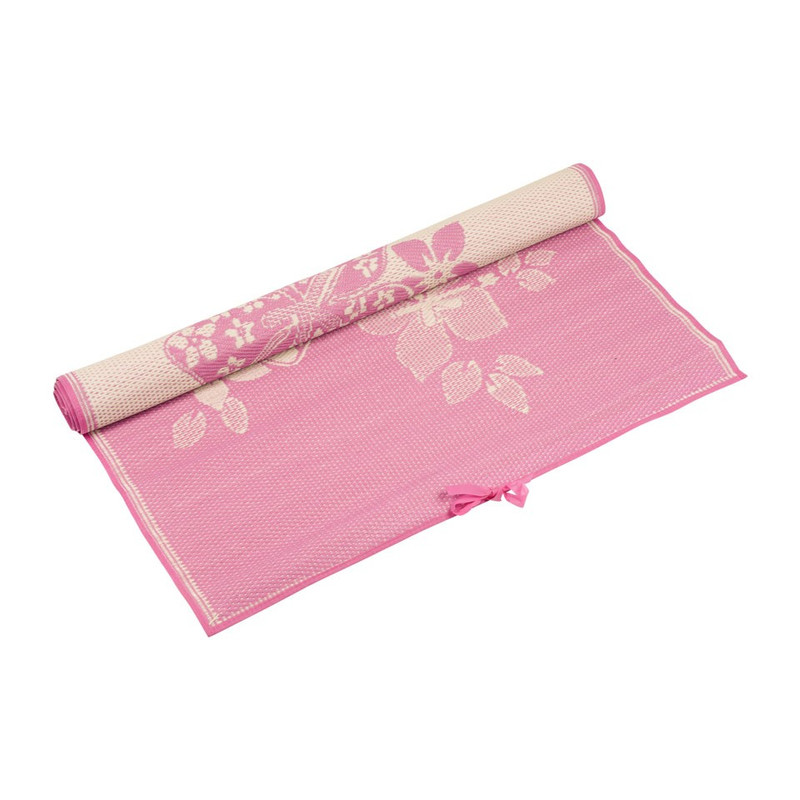 De mat is roze met wit en heeft een mooie opdruk van bloemen aan beide kanten. De kleurstelling aan de onderkant is precies andersom. Dankzij het touwtje kun je deze gemakkelijk weer oprollen en vastbinden.