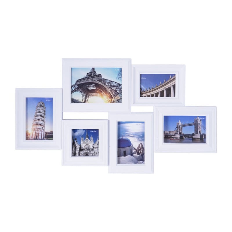 De collagelijst heeft frames van verschillende afmetingen, waardoor deze er speels uit ziet. Je kunt er 2 foto’s van 10x15 cm, 1 foto van 15x10 cm, 1 foto van 10x10 cm, 1 foto van 13x9 cm en 1 foto van 18x13 cm in kwijt. De collagelijst heeft een frisse witte kleur en is eenvoudig op de muur te hangen dankzij de haakjes op de achterkant. Hij kan zowel horizontaal als verticaal opgehangen worden.