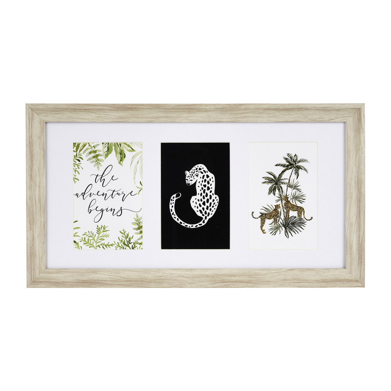 Lijst je mooiste herinneringen in met deze collagelijst. De collagelijst is gemaakt van kunststof, maar heeft een houten look. De naturel kleur maakt dat de collagelijst in vrijwel elk interieur past. De collagelijst is voorzien van een witte passe partout waar drie uitsparingen zitten voor foto's en is daarmee geschikt voor foto's van 10x15 cm. Je kan de lijst ophangen. De totale afmeting van de fotolijst is 44x24 cm.