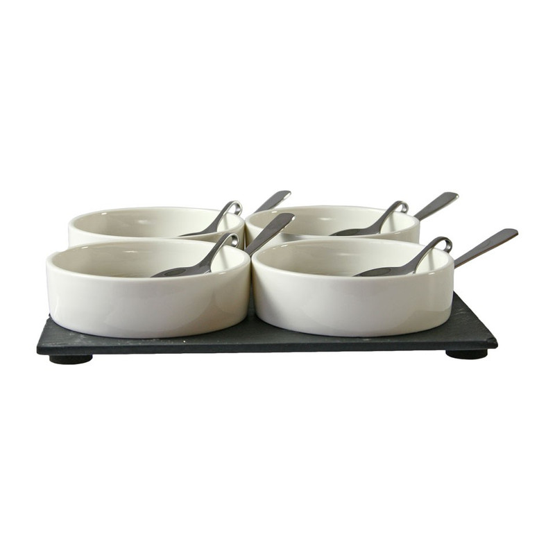 Serveer aperitiefhapjes of soepjes in deze 4 porseleinen schalen met hanglepel. Een kwartet van schalen op een leisteen, binnen of buiten, voor een receptie of een luchtig onderonsje. Neem een schaal en geniet!