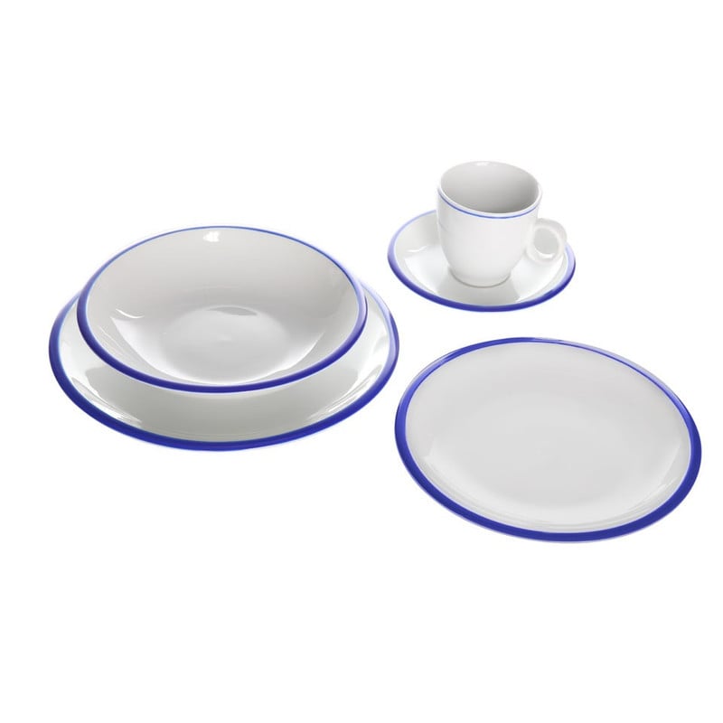 Pleasure blue dinnerset met 20 onderdelen: vier platte borden en telkens dezelfde hoeveelheid dessertborden, diepe borden en kopjes met schoteltjes. Door het kleuraccent krijgt het servies extra uitstraling. De afmetingen zijn: bord Ø 25 cm, dessertbord Ø 20,5 cm, diep bord Ø 20,5 cm, kopje Ø 8 x H 8 cm en schoteltje Ø 15 cm.