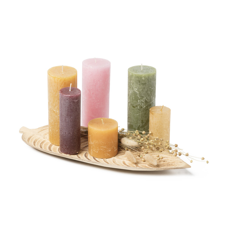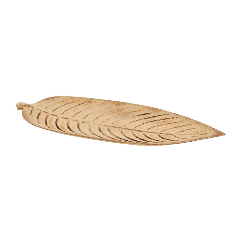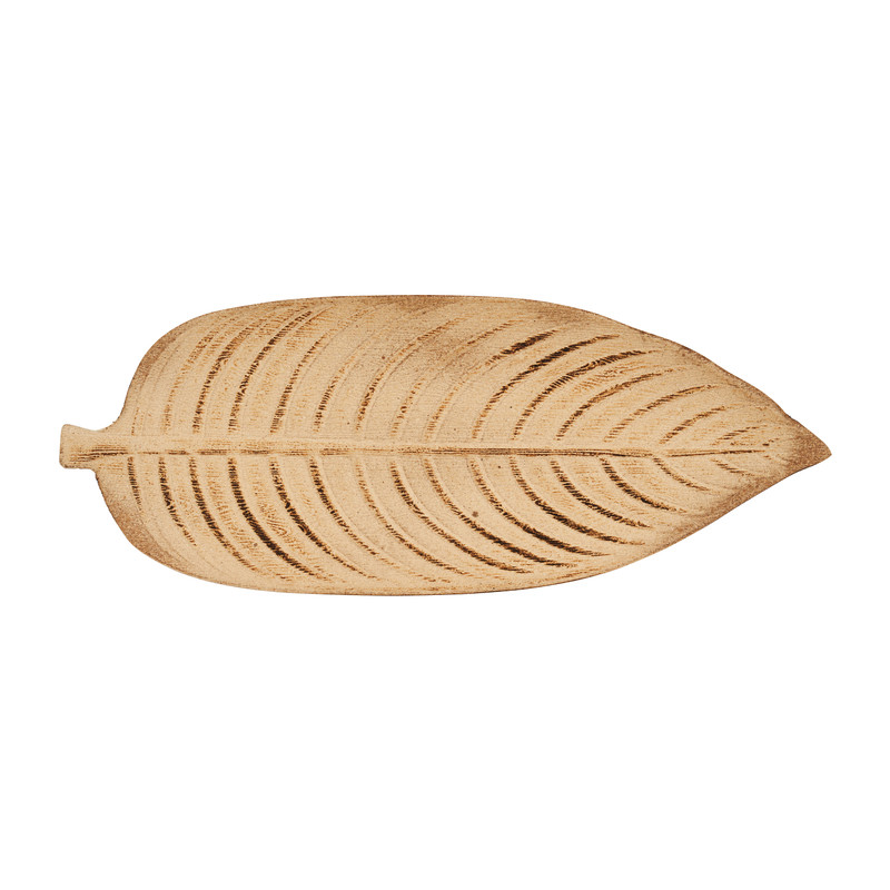 Dit natuurlijke plateau is een echte eyecatcher voor op tafel. Het mooie decoratiestuk heeft de vorm van een blad, inclusief nerven die erin zijn gebrand. Leuk met een paar kaarsen en beeldjes erop. Het blad is 45.5 cm lang, 18 cm breed en gemaakt van fijne houtvezels.