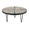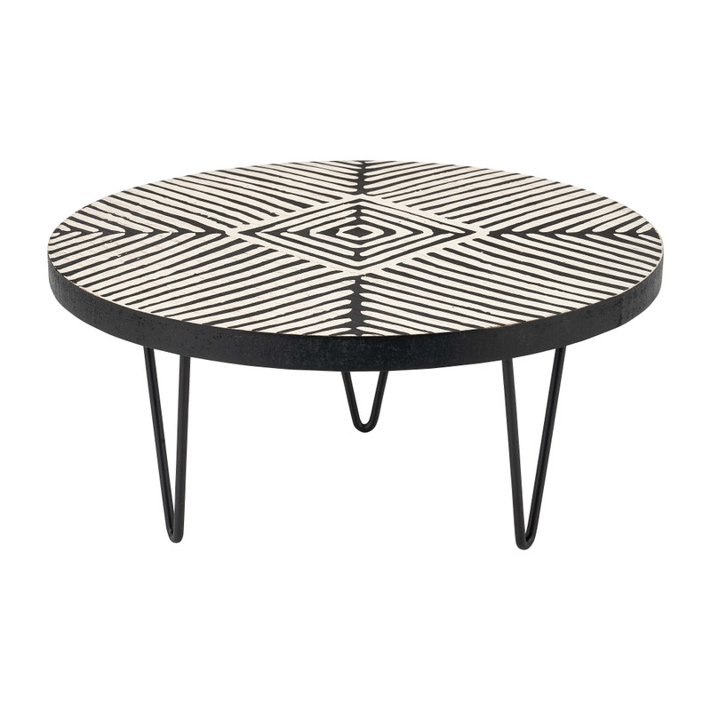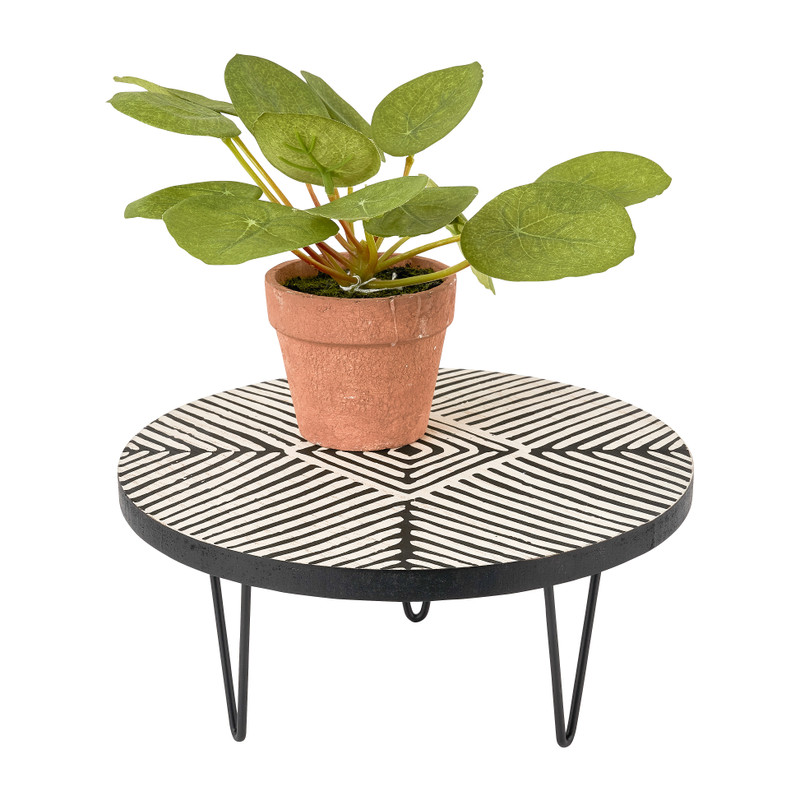 Deze decoratieplateau maakt jouw salontafel een stuk gezelliger. Zet er een klein vaasje op, een mooie kaars of een klein plantje ter decoratie. De bovenkant heeft een zwart geverfd patroontje en er zitten metalen poten onder bevestigd. De diameter is 23 cm en de hoogte is 12 cm. • Decoratieplateau