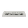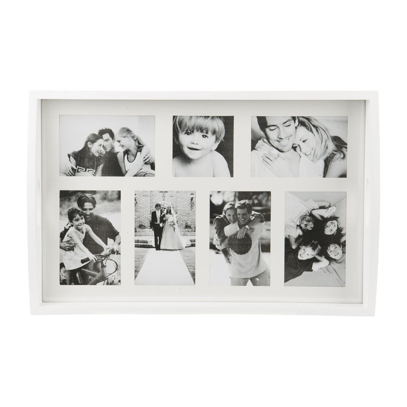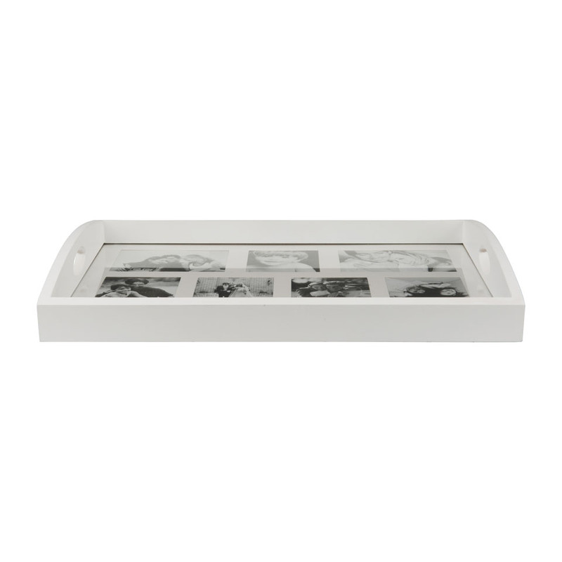 Serveer jouw drankjes en hapjes op dit witte dienblad tijdens een feestje. Hij dient daarnaast ook perfect als woonaccessoire. De bodem van het blad is namelijk een collagelijst voor meerdere foto’s. In totaal kun je in dit dienblad zeven foto’s kwijt van je leukste momenten. Leg het presenteerblad op de salontafel en kleed hem nog wat verder aan met verschillende bloemenvaasjes. Zo heb je een origineel tafelstuk wat er prachtig uit ziet. Het houten dienblad heeft een afmeting van 32x50x4 cm. Aan de zijkanten zijn twee praktische handgrepen gemaakt waarmee je het blad gemakkelijk kan optillen en meedragen. Ideaal als je er glazen limonade of kopjes koffie mee wilt rondbrengen.