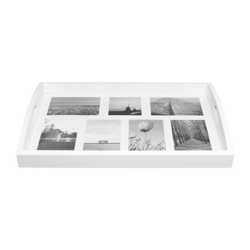 Dit witte dienblad is niet alleen geschikt om drankjes en hapjes rond te brengen naar de visite of tijdens een feestje. Hij dient ook perfect altijd woonaccessoire. De bodem van het blad is namelijk een collagelijst voor meerdere foto’s. In totaal kun je in dit dienblad zeven foto’s kwijt van je vrienden, familie en allerlei leuke momenten. Leg het presenteerblad op de salontafel en kleed hem nog wat verder aan met verschillende kaarsjes, theelichten en een bloemenvaasje. Zo heb je een origineel tafelstuk wat er prachtig uit ziet. Het houten dienblad heeft een afmeting van 32,5x50x6,5 cm. Aan de zijkanten zijn twee praktische handgrepen gemaakt waarmee je het blad gemakkelijk kan optillen en meedragen. Ideaal als je er toch glazen limonade of kopjes koffie mee wilt rondbrengen. Het dienblad voor foto’s is tevens ook verkrijgbaar in het zwart.