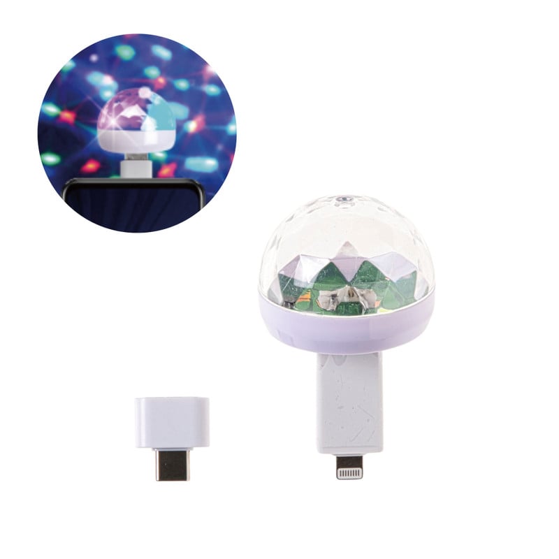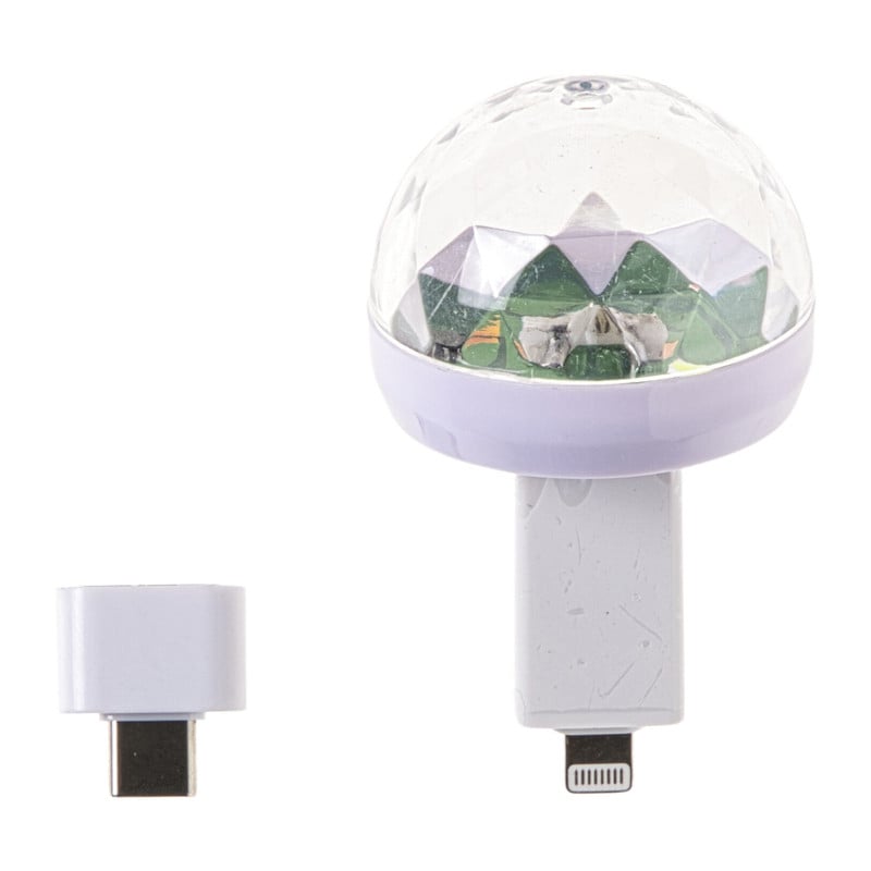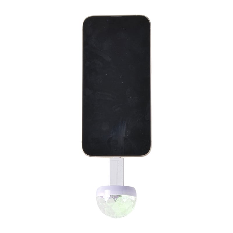 Je hebt geen batterij nodig. Sluit je smartphone aan, speel je muziek af en de discolight begint op te lichten op de maat van de beat. Inclusief USB en USB-C aansluiting.