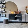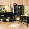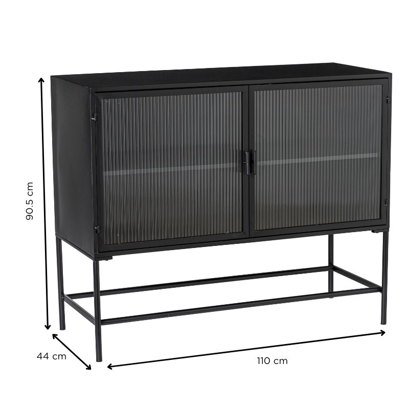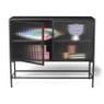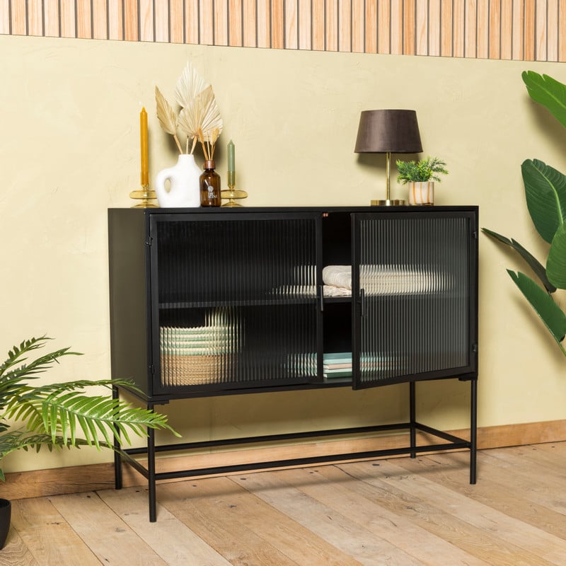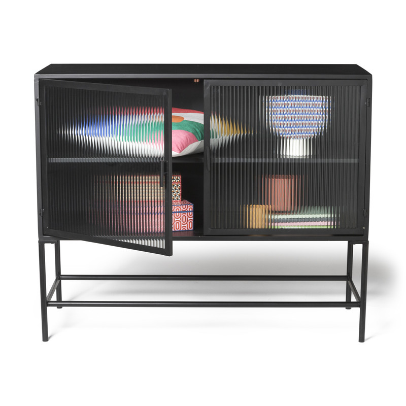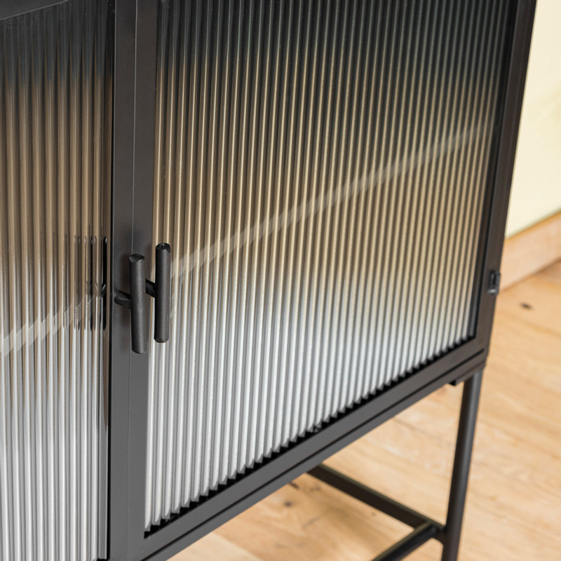 De kasten uit de Memphis serie zijn gemaakt van metaal en geribbeld glas. Deze materialen zorgen voor een stoere look!