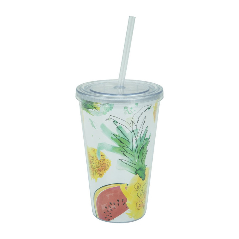 Deze zomerse dubbelwandige drinkbeker met rietje houd je jouw drankje heerlijk koel. Dankzij de dubbele wand blijft jouw drankje langer koel dan in een normale drinkbeker. De handige deksel en het rietje zorgen ervoor dat je de beker gemakkelijk overal mee naartoe kunt nemen. Tussen de wanden zit een zomerse afbeelding van meloenen en ananas. De drinkbeker is 16x10 cm en heeft een inhoud van 50 cl. De beker is niet geschikt voor warme dranken.