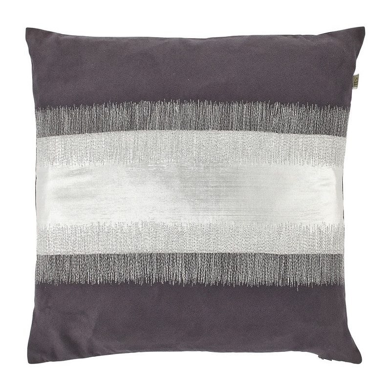 Een sierkussen in de maat 45x45 cm vervaardigd van polyester en suede. Dit chique kussen in de kleur zwart heeft aan de voorzijde een zilverkleurige strook en zilverkleurige stiksels. Deze sierkussens worden geleverd met een 45x45 cm binnenvulling.
