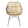 De eetkamerstoel is gemaakt van rotan en metaal.