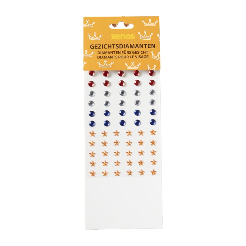 Shine bright like a diamond op Koningsdag! Met deze face diamonds geef je je look een extra feestelijke touch. Plak ze op je gezicht of lichaam en straal de hele dag door. De set bevat 90 steentjes in oranje, rood, wit en blauw, perfect voor een koninklijke uitstraling. Zelfklevend en super makkelijk op te plakken, zodat jij binnen no-time party ready bent!