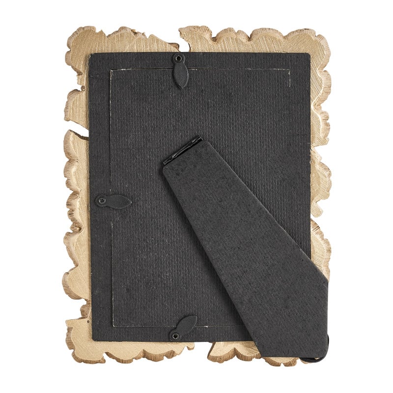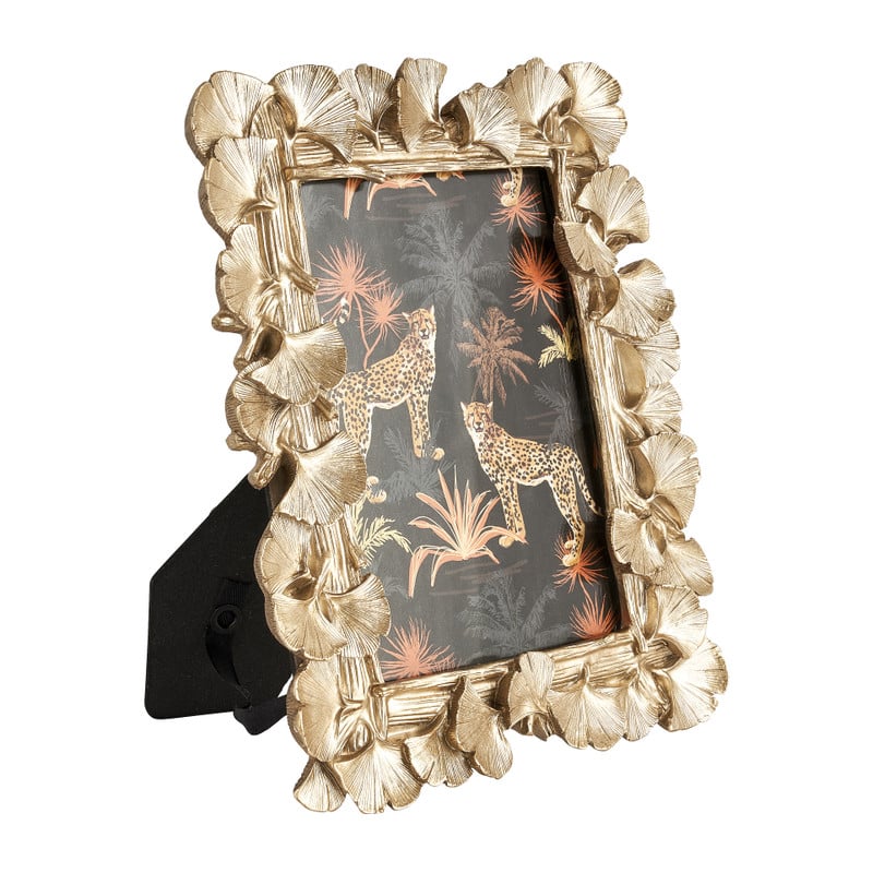 Deze fotolijst is helemaal versierd met ginkgo bloemen. De mooie gouden blaadjes vormen een bijzondere rand en door de gouden kleur valt het lijstje op tussen andere fotolijsten. Dankzij de uitklapbare standaard is het fotolijstje eenvoudig neer te zetten op een dressoir, vensterbank of tv-meubel. De lijst is 16x20 cm. In het fotolijstje past een foto met een afmeting van 9x15 cm.