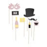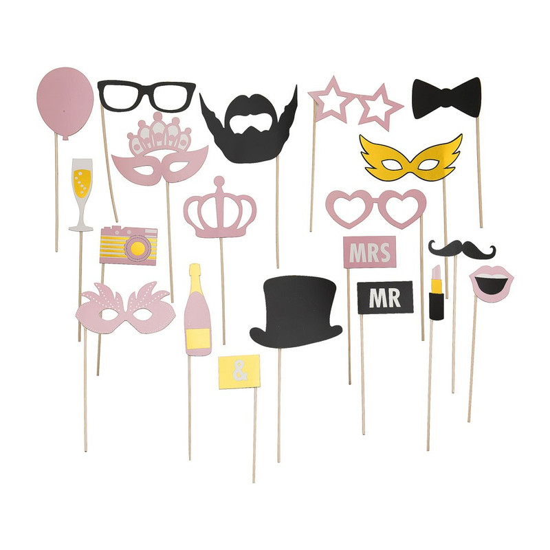 Maak leuke, sfeervolle foto's met deze chique foto accessoires. In deze set zitten 20 verschillende soorten props op een stokje. De props inclusief stokje zijn allemaal ongeveer 20 cm hoog. Van maskers tot hoeden en champagne tot snorren. Je vindt veel leuke accessoires die super grappige foto's opleveren. De props hebben de kleuren roze, wit, goud en zwart en passen goed bij een huwelijksfeest.