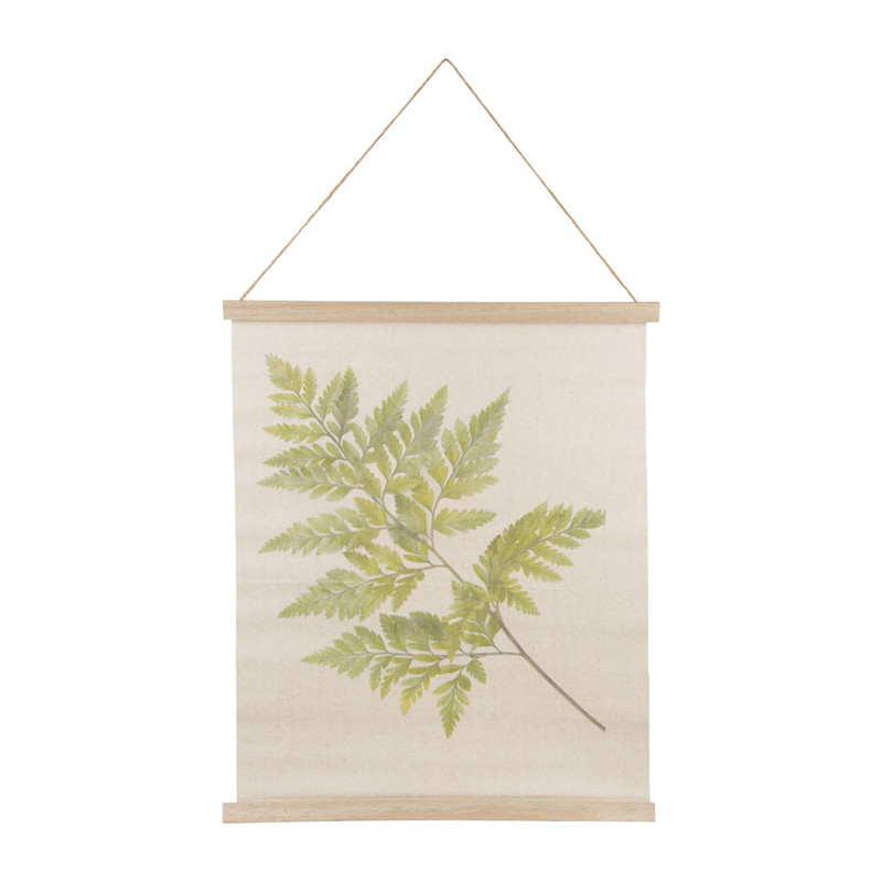 Leuk doek met een afbeelding van bladeren erop. Mooi voor in de hal! Dit doek heeft een afmeting van 54x44 cm en heeft zowel aan de boven- als onderkant een houten latje. Dankzij het touw kun je deze gemakkelijk ophangen aan een haakje op spijker.