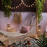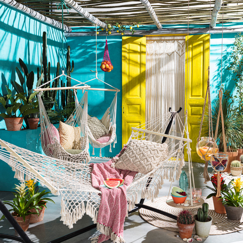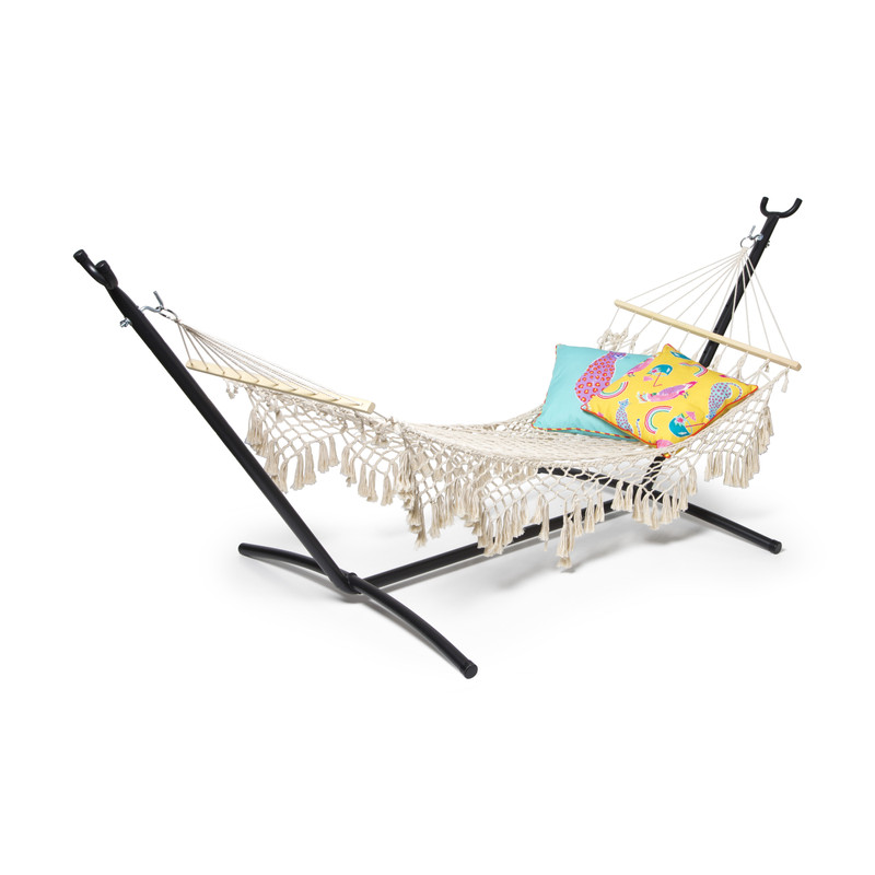Geknoopte hangmat gemaakt van polykatoen. De hangmat heeft een macramé look. Super leuk om in de tuin te hangen en om in te genieten in het zonnetje. Afmeting: 90x200 cm.