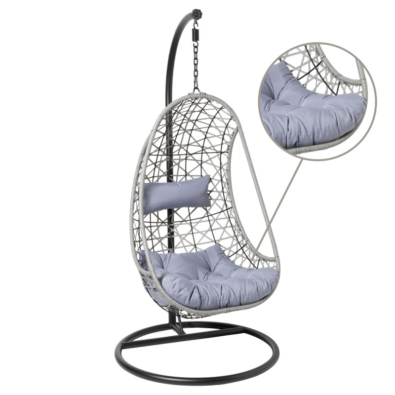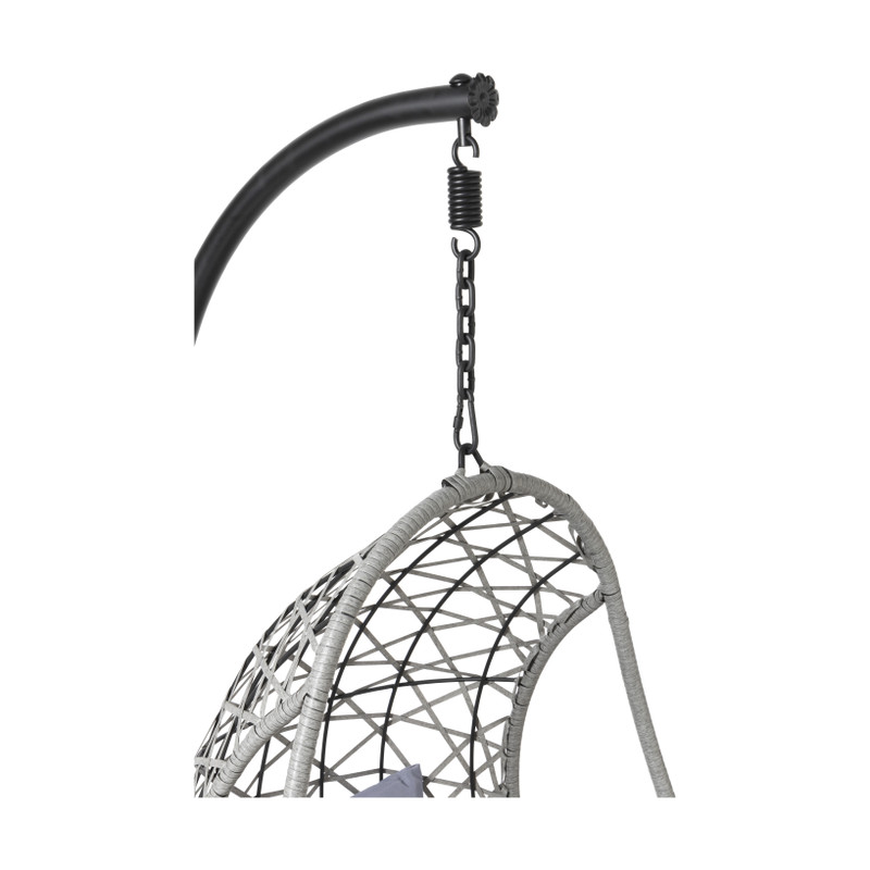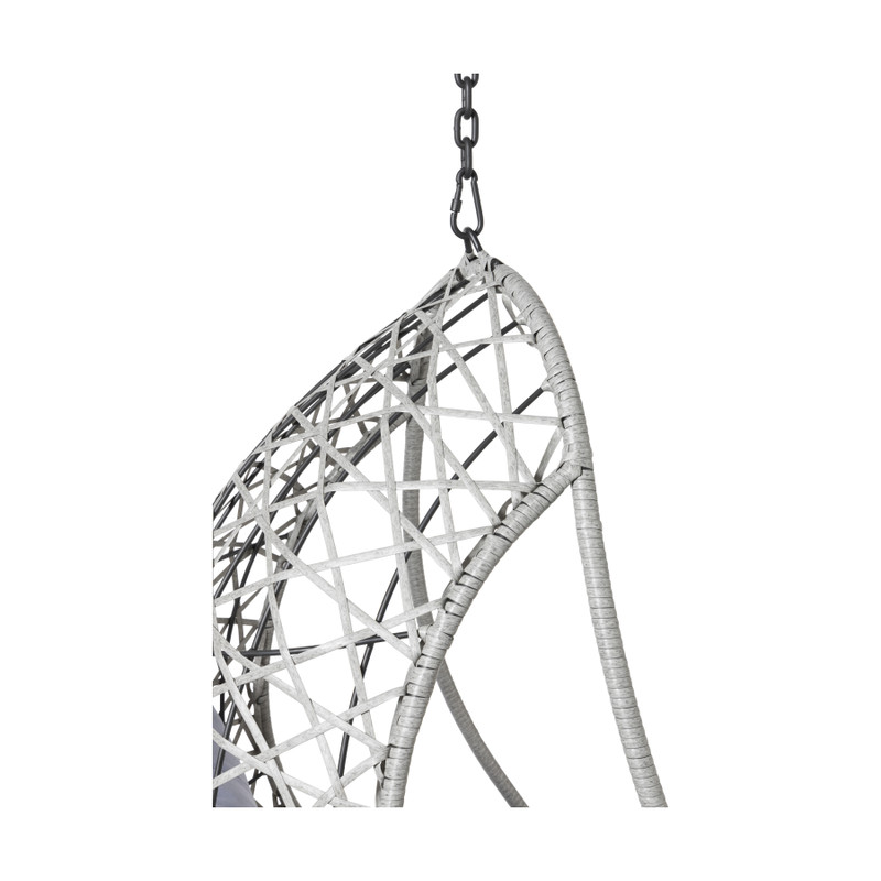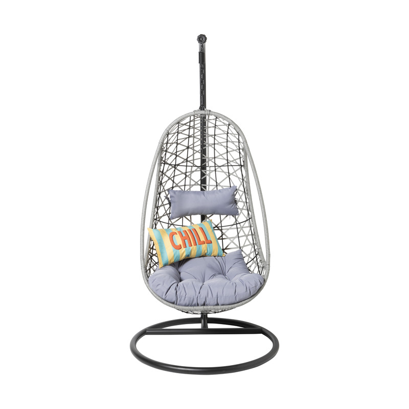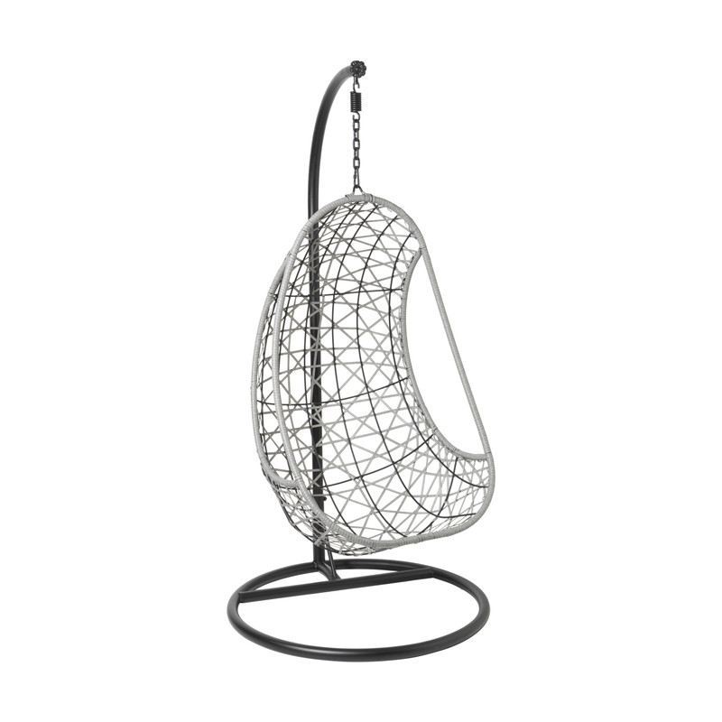 Met hangstoel Ibiza haal jij het ultieme loungegevoel in huis! De trendy hangstoel heeft een stijlvol opengewerkt design en wordt geleverd met een stevig standaard, zodat je hem overal kunt neerzetten. De zachte, grijze kussens bieden optimaal comfort, zodat je urenlang kunt wegdromen met een goed boek of gewoon even lekker kunt ontspannen. Dankzij de stevige metalen standaard met ronde voet staat de stoel stabiel en veilig, terwijl de stevige ophangketting zorgt voor een lichte schommeling – alsof je op vakantie bent in je eigen huis of tuin!