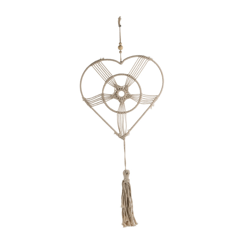 Harten staan symbool voor de liefde. Dit decoratie hart van touw zorgt ongetwijfeld voor een warme sfeer in huis. Het hart is 40 x 80 cm en heeft een neutrale kleur. Hang het bijvoorbeeld in de slaapkamer, aan de deur of in de badkamer. Het kan overal!
