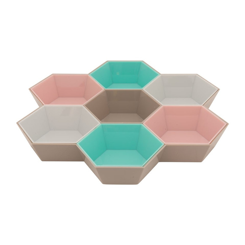 Zet lekkere snacks op tafel met deze trendy snack set. Deze leuke schaal is ideaal als je verschillende borrelhapjes, snacks of salades wil serveren. De grote schaal bestaat uit 7 kleinere schaaltjes waar je allerlei lekkere dingen in kan doen. De grote schaal heeft de vorm van een honingraat, net als de kleinere bakjes. Je kan de kleine bakjes uit de grote schaal halen. Dat is makkelijk serveren en het ziet er super trendy uit! * Honingraat schaal – snackbak * Grote schaal + 7 kleine snackbakjes * Trendy kleuren * Mooie honingraat vorm * Voor snacks, borrelhapjes, salades of tapas