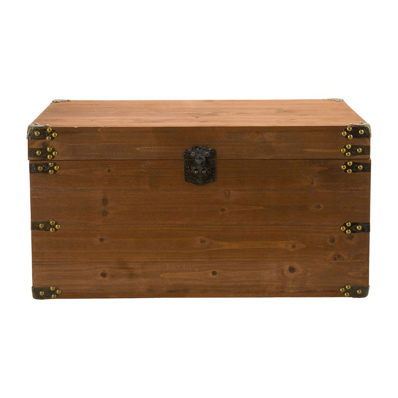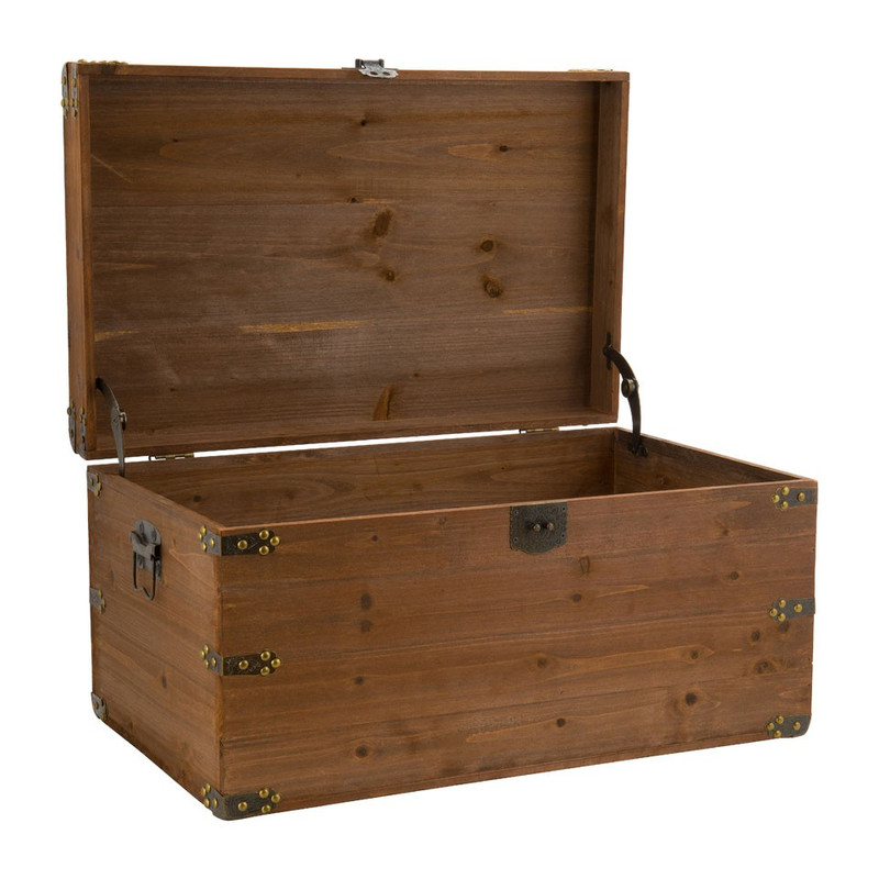 Deze houten kist met beslag is niet alleen erg praktisch, maar ook nog eens ontzettend decoratief en mooi. Aan de zijkanten zijn twee metalen handvaten gemonteerd, waarmee de kist gemakkelijk opgetild kan worden. Handig als je hem eens wilt verplaatsen bijvoorbeeld. De sluiting voorop de kist en het overige beslag zijn van dezelfde kleur metaal gemaakt als de handgrepen.