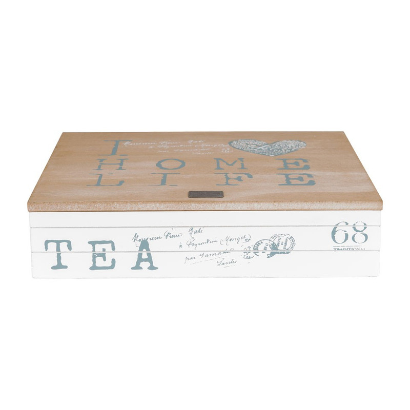 Aan ruimte geen gebrek met deze 12 vaks theedoos die aan al jouw favoriete theesmaken de ruimte biedt. De wit met grijs en houtgekleurde theedoos heeft een opdruk met de tekst 'I love home life', en geeft aan ieder iterieur een warme huiselijke sfeer.