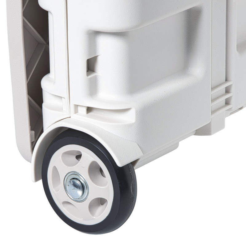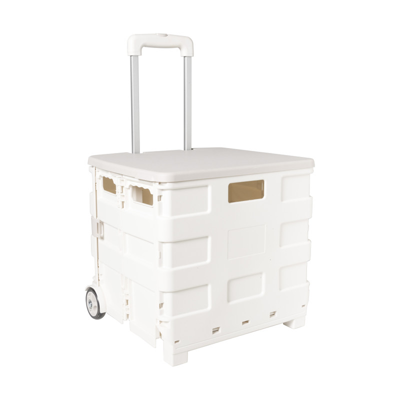 Waarom sjouwen als je ook kunt rollen? Deze inklapbare boodschappentrolley in fris wit is jouw ultieme hulpje voor elke boodschap, picknickdagje, bezoeke aan de markt of opslagklus. Met z’n royale inhoud is er plek zat voor boodschappen, flessen, dozen of zelfs voor je hobbyspullen. De stevige kunststof constructie in combinatie met het uitschuifbare aluminium handvat en twee soepele wieltjes zorgen ervoor dat je ‘m moeiteloos voorttrekt – zelfs als-ie goed vol zit.