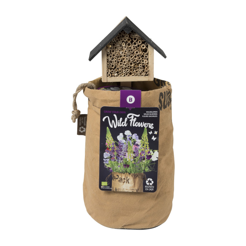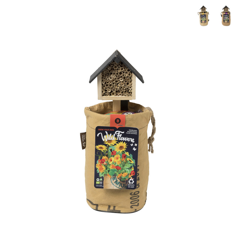Help de insecten in je tuin een handje met dit insectenhotel en groei je eigen bloemen! Het hotel is voorzien van buisjes waarin de insecten kunnen verblijven. Een insectenhotel is een waardevolle aanwinst voor jouw tuin, modat insecten een natuurlijke vorm van plaagbestrijding bieden en kunnen helpen bij de bestuiving van planten. Onder het insectenhotel bevindt zich een zak met zaadjes, waaruit wilde bloemen zullen groeien. Het insectenhotel is gemaakt van gerecyclede theezakjes, waardoor het een milieuvriendelijke optie is.