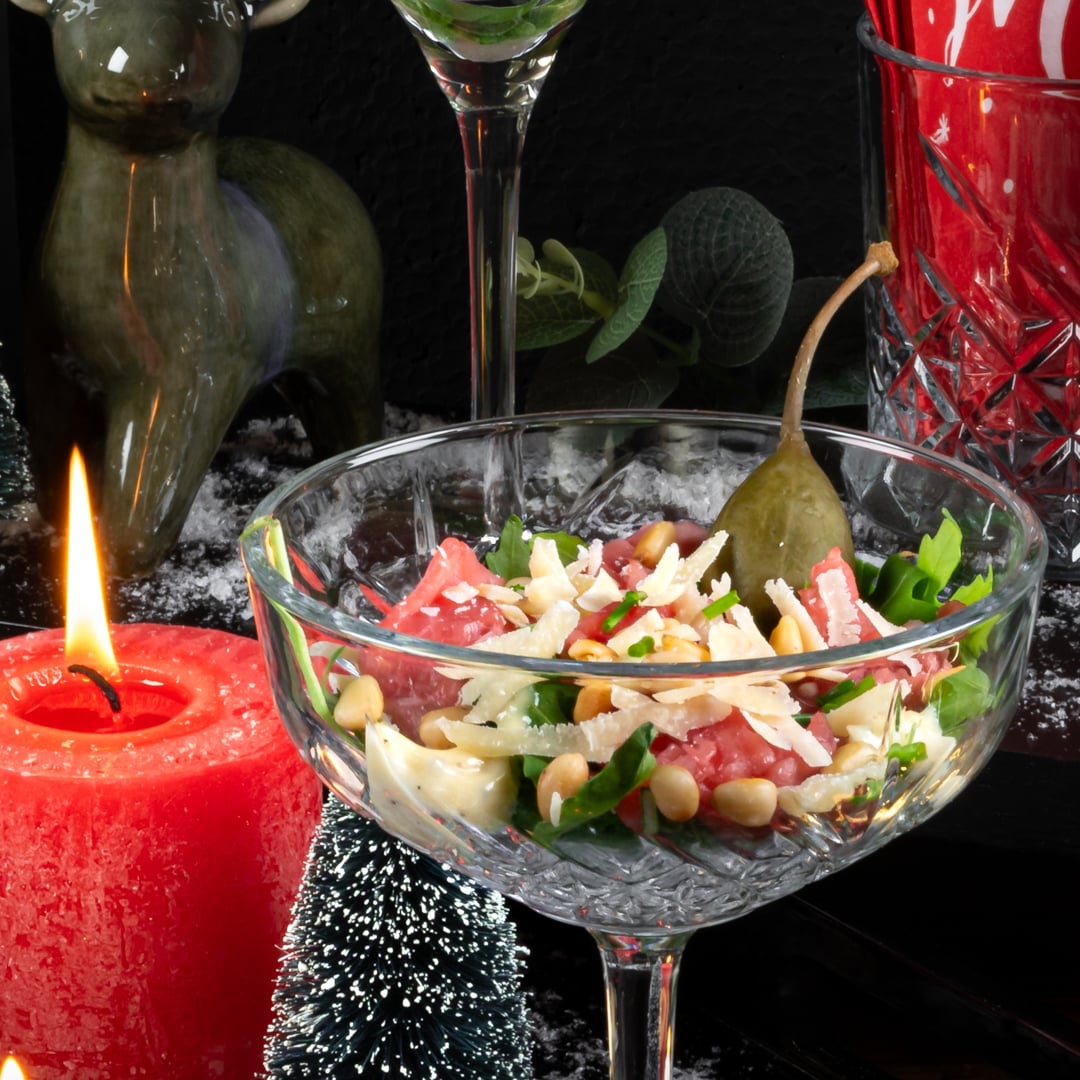 Het aftellen naar het nieuwe jaar is begonnen. Verras jouw vrienden of familie met feestelijke hapjes voor bij de champagne. Of je nou voor familieklassiekers gaat of nieuwe smaken wilt uitproberen: het oog ook wat. Met een mooie presentatie tover je zelfs de meest simpele recepten om tot een prachtig gerecht. Gebruik bijvoorbeeld glazen in plaats van borden. Zonder moeite zet je daarmee een feestelijke sfeer neer. Perfect voor oudjaarsavond als je gezellig met elkaar aan tafel zit.