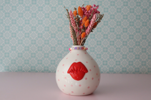 Rijg gekleurde kraaltjes aan elkaar en gebruik de letterkralen voor de juf. Maak het vast zodat je een armbandje hebt. Om de maat te bepalen gebruik je de pols van mama om te meten. Hang het armbandje om de hals van het vaasje en zet het bosje (droog)bloemen in de vaas. That's it!