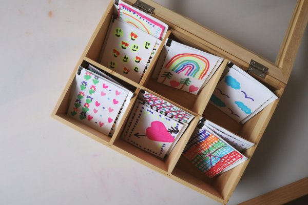 Pak het velletje wit papier en knip hier blaadjes ter grootte van het theezakje uit. Knip er net zoveel als de hoeveelheid theezakjes die je hebt. Laat je kind elk blaadje inkleuren of versieren met de leukste tekeningen. Plak alle blaadjes met dubbelgevouwen plakband aan de theezakjes. Doe de theezakjes in de theedoos met de tekening naar voren. Dat ziet er vrolijk uit!