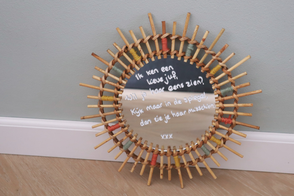 Knip een stuk draad van het garen, draai de spiegel om en knoop dit om een stokje van de spiegel. Zet het vast met plakband. Draai het draadje om het stokje van de spiegel totdat het helemaal gevuld is. Aan het einde knoop je het vast. Herhaal dit bij meerdere stokjes. Je kunt dit bij elk stokje toepassen of ook af en toe eentje (of meer) overslaan. Varieer met verschillende kleuren garen voor een speels effect. Wanneer je hiermee klaar bent is het tijd voor de krijtstift. Pak deze erbij en maak het glas goed schoon. Schrijf een leuke tekst voor de juf of meester op de spiegel, bijvoorbeeld: "Ik ken een lieve juf, wil je haar eens zien? Kijk maar in de spiegel dan zie je haar misschien."