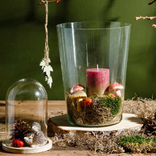 Verzamel mos, kleine decoratieve paddenstoelen en een kaars voor een sfeervolle herfstdecoratie. Zet ze samen in een doorzichtige vaas of stolp voor een prachtig herfststuk.
