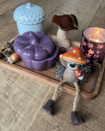 - Speel met hoogtes en kleuren, voeg eventueel een kleine herfstkandelaar toe. Het plateau is klaar als het een gezellige, warme uitstraling geeft die perfect bij jouw interieur past.